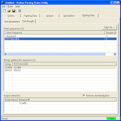 In this posting, I will show you how to use the Define Parsing Rules Utility to handle a simple example - 6 digits postal code strings. We will define a rule to output one 'postal code' token from input text strings. Perhaps in future I can post a more complex example.