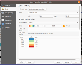 - In the Rendering type field, choose Singleband pseudocolor. Choose a suitable color gradient e.g. Spectral and toggle Invert if necessary. Choose a suitable Blending mode e.g. Screen.